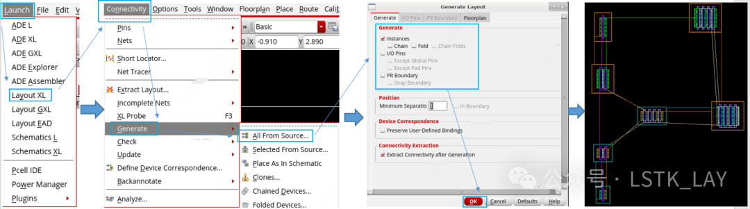 打开原理图,菜单栏Launch—Layout XL,在弹出的layout界面中的菜单栏选择:Connectivity—Generate—All From Source...,可以一次性生成原理图中所有的器件,并且调出的器件与原理图中的器件一一对应,并且器件与器件之间包含有连接关系。相关操作如下图:
