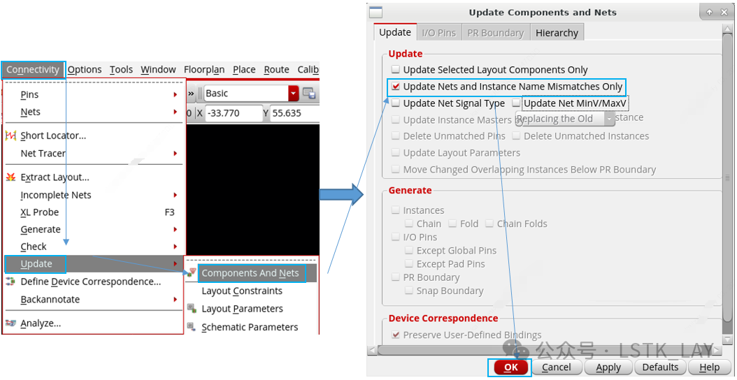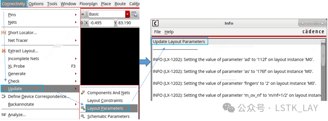场景描述:版图layout进行中时,designer中途需要调整部分管子的参数,并修改了部分net名称;此时版图工程师需要对应更新layout中的相关参数。