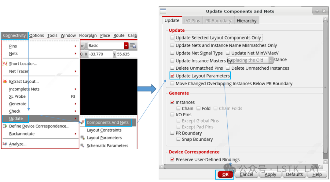 方法2:无需在原理图中选中对应更改的管子,直接在layout_xl界面,菜单栏Connectivity—Update—Components And Nets,在对应弹出的对话框中选中Update Layout Parameters,即可更新原理图中所有修改管子的参数。(此方法较适合你不清楚原理图修改地方的情形或原理图修改地方较多的情形)