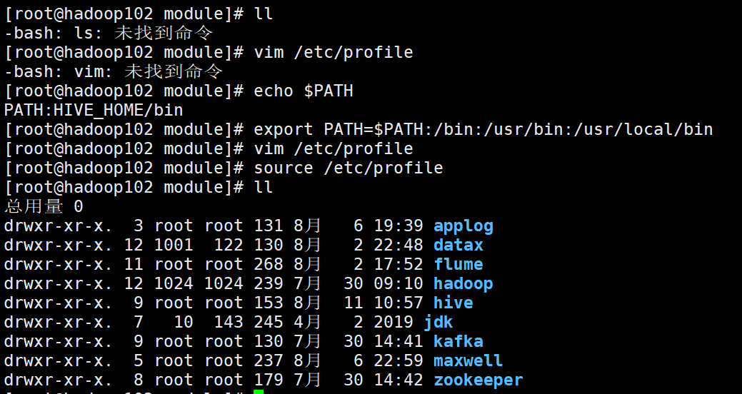 当前 PATH 只包含 HIVE_HOME/bin,而没有包含常见的命令目录(如 /bin, /usr/bin 等)