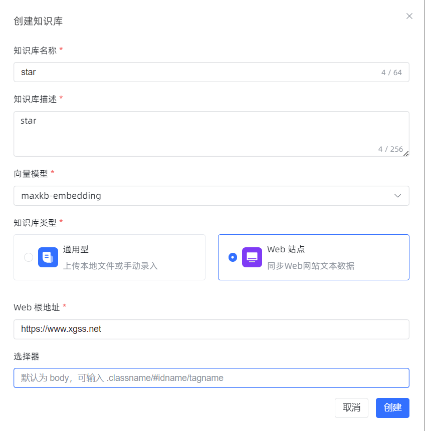 在MaxKB应用界面中,点击“知识库”菜单,选择创建知识库,填写相关信息后创建并导入知识库。在“知识库类型”选项中,离线文档选择“通用型”类型,在线文档选择“Web站点”类型。知识库创建界面如下: