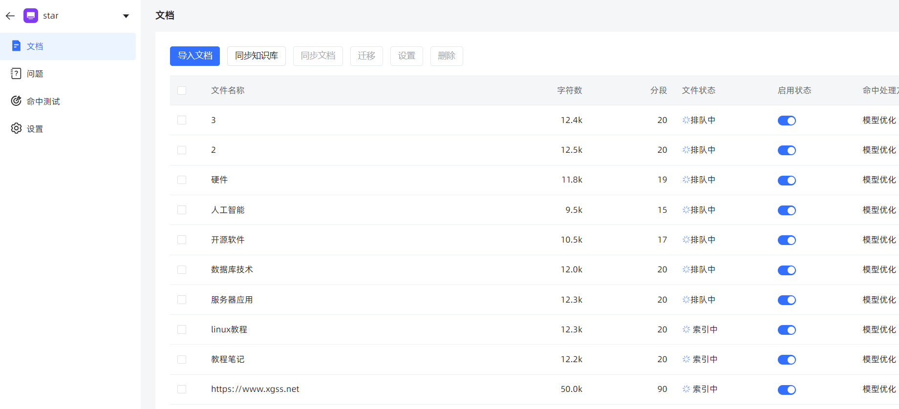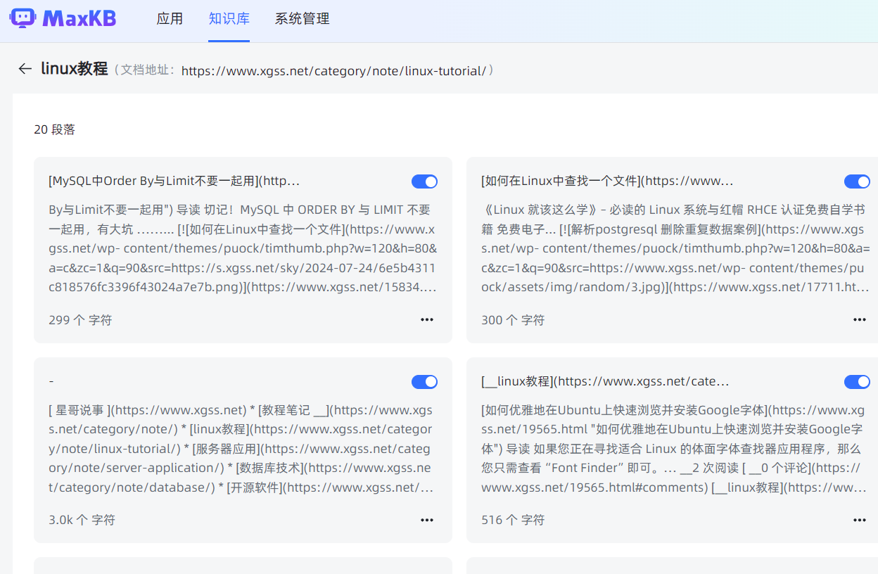 MaxKB支持用户使用文档列表查看导入的文本数据。系统会自动爬取根地址及子地址的文本数据,按照URL地址生成文档,并自动拆分和进行向量化处理。