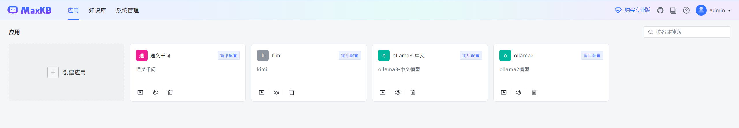 如下图,进入后台之后有“应用”,“知识库”,“系统管理”三大主要功能。