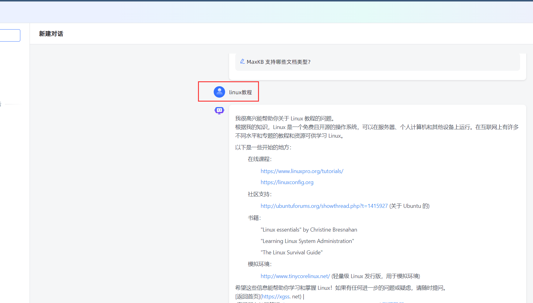 在应用对话中“linux教程”