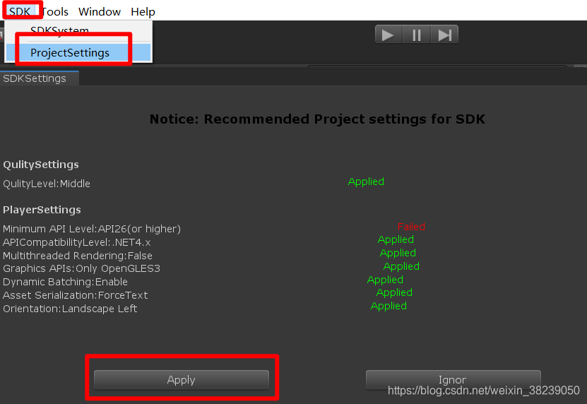 在工具栏--SDK--ProjectSettings里,其实能打开一键配置面板,在这儿点Apply,也可完成一键配置。