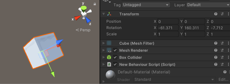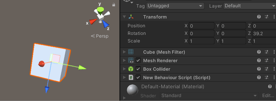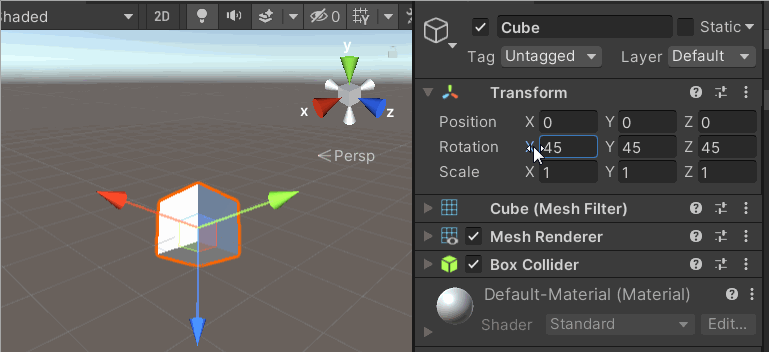父物体的旋转角度,会影响子物体的轴向。 我们对这个没有父物体的GameObject进行了X、Y旋转了45度,如果再对这个物体的Z进行旋转, 那么就相当于这个物体的父物体是一个(45,45,0)旋转角度的物体,这个物体是(0,0,0)旋转的物体,我们给这个物体旋转Z轴。