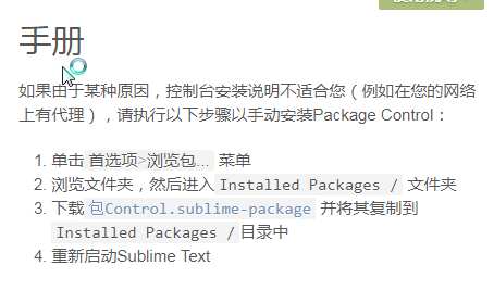 import urllib2,os,hashlib; h = '6f4c264a24d933ce70df5dedcf1dcaee' + 'ebe013ee18cced0ef93d5f746d80ef60'; pf = 'Package Control.sublime-package'; ipp = sublime.installed_packages_path(); os.makedirs( ipp ) if not os.path.exists(ipp) else None; urllib2.install_opener( urllib2.build_opener( urllib2.ProxyHandler()) ); by = urllib2.urlopen( 'http://packagecontrol.io/' + pf.replace(' ', '%20')).read(); dh = hashlib.sha256(by).hexdigest(); open( os.path.join( ipp, pf), 'wb' ).write(by) if dh == h else None; print('Error validating download (got %s instead of %s), please try manual install' % (dh, h) if dh != h else 'Please restart Sublime Text to finish installation')网络不好的话,就按着官方的另一种方法来吧