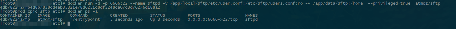docker run -d -p 6666:22 --name sftpd -v /app/local/sftp/etc/user.conf:/etc/sftp/users.conf:ro -v /app/data/sftp:/home --privileged=true atmoz/sftp