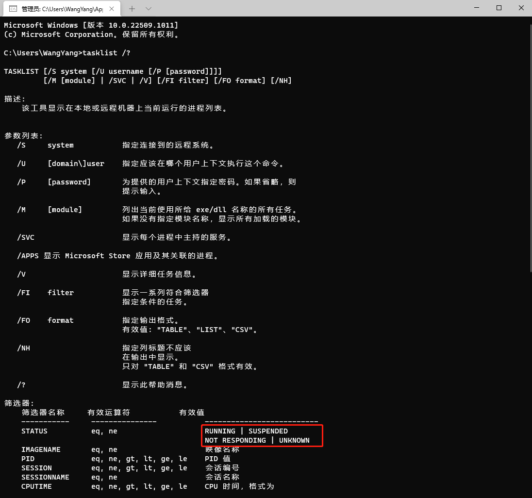 :: 检测状态为未相应的应用进程 | 所有不理解的命令均可通过帮助进行查看,示例如下