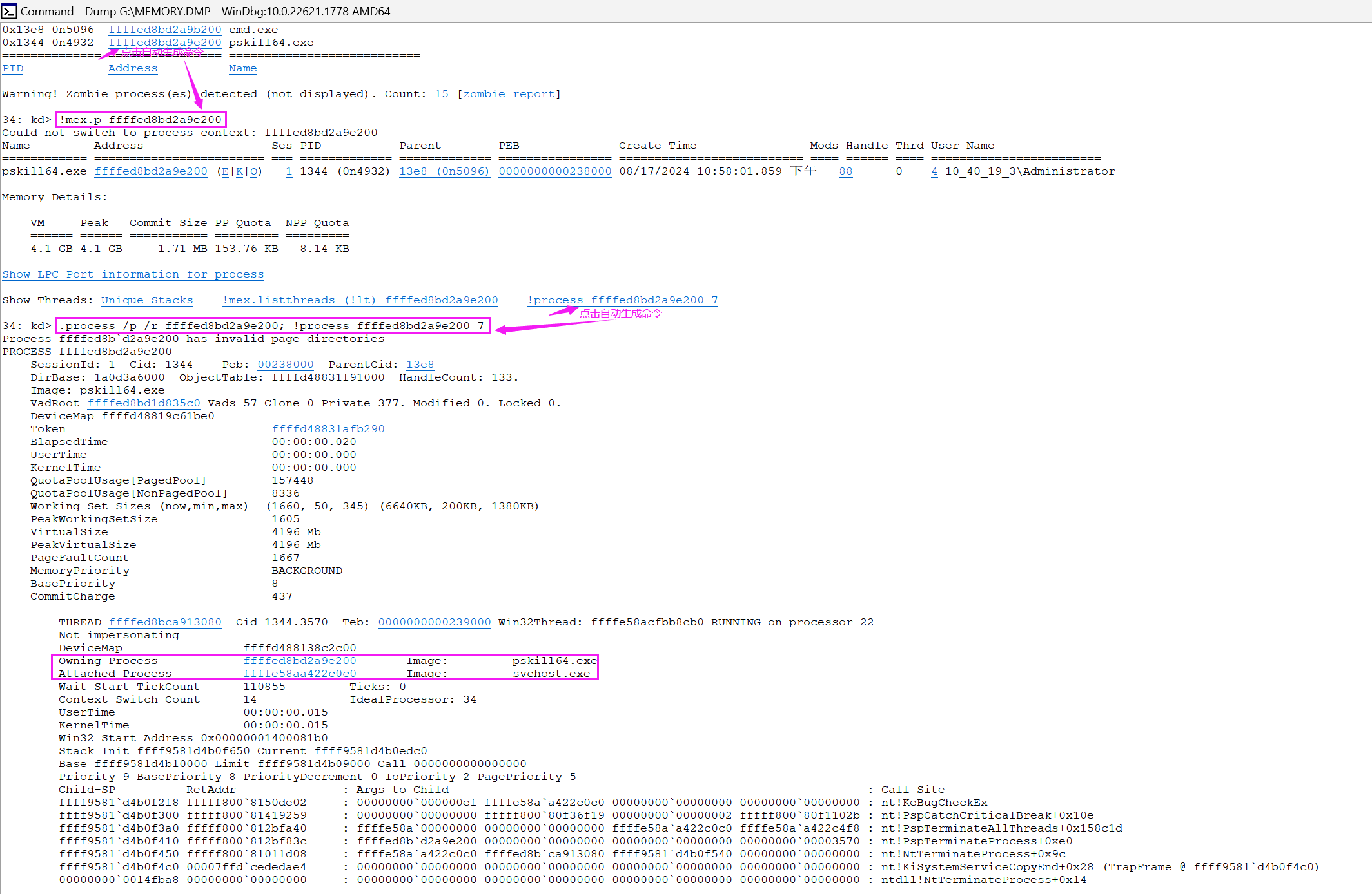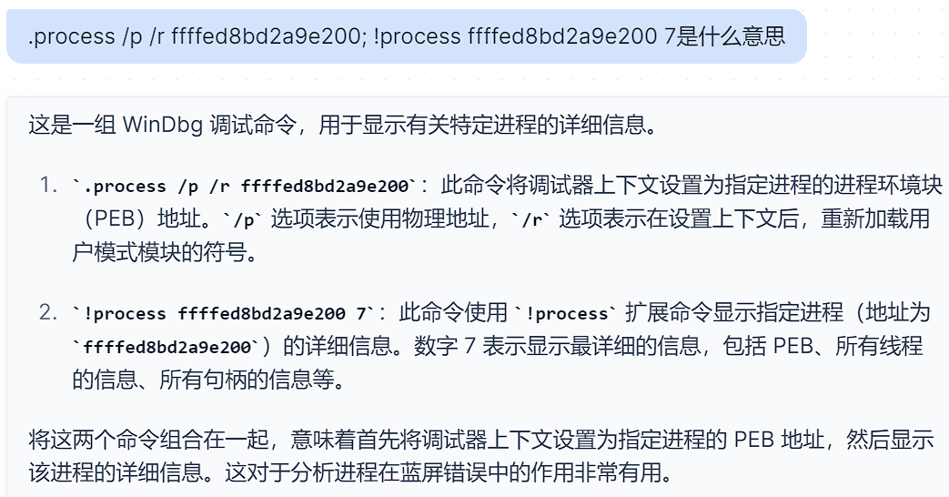 固定用法:.process /p /r 进程物理地址; !process 进程物理地址 7