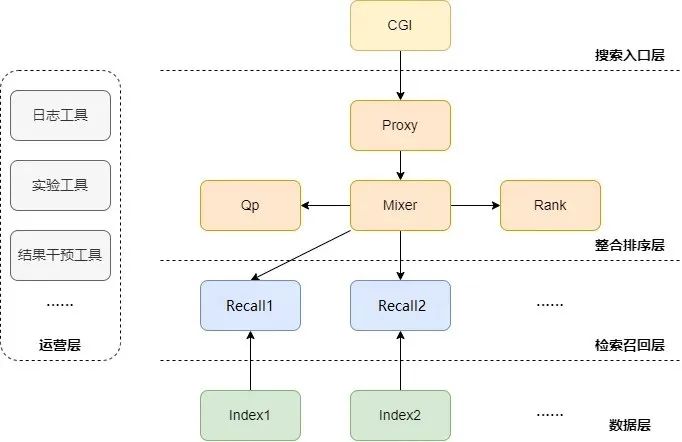 搜索入口层。搜索入口一般指 cgi。各类搜索(如发现搜索、相关搜索等)都会发送至 cgi,拉取相关参数后(如用户关系链、用户画像等)组成请求,转发至后台。入口层是连接用户侧和后台服务侧的桥梁,还可承担如流量管理、兜底缓存等功能。 整合排序层。这一层一般有 qp、proxy、mixer 及 rank 等,对搜索整体流程进行综合调度。qp 模块对 query 进行处理,包括分词、纠错、改写、意图分析等,用以确定检索策略;proxy 模块则承担一些流量均衡、doc 组装、过滤、上报等逻辑,mixer 模块则承担具体的调度逻辑,如召回、打分、排序等,两者可以分别部署,也可以合并为一个模块,具体依赖于系统设计;rank 一般指粗排、精排、混排,将各种类型的召回结果有序组合。 检索召回层。召回层主要负责从索引集群中进行 doc 的召回和求交计算。索引集群一般分为时新、全量,分别存放新热文章和全量文章。集群间互相配合,分担在线检索和离线刷库的流量压力,同时可根据不同的召回策略提升召回多样性。 数据层。各类图文、视频等数据,会在数据层进行原始数据导入、向量计算、特征因子接入管理等统一操作,生成可被检索的索引数据,为用户提供高效、准确、多样的检索服务。数据层中还会有各种离线任务和离线模型,不断进行迭代训练及数据写入,以保证索引最新、最广、最全。 运营层。为了保障搜索质量,还有一系列效率工具和平台协助开发人员对系统进行监控和跟进,如日志分析,现场还原,实验分析、结果干预等。这些工具可以帮助我们追踪每次搜索行为的细节,细化监控系统中的每一个角落,为搜索系统的健康运行提供有力保障。 综上流程,当一个 query 从 cgi 进入后,会连同一些必要的用户参数,组成请求包传送至整合排序层;整合排序层再拉取必要的 qp 信息(如纠错、改写等),旋即发送至检索层,对数据层中离线计算好的数据进行求交召回;检索获取的结果会返回至整合排序层,再进行一次或多次排序(粗排、精排、混排);最后将组装好的结果返回至入口层,由入口层进行数据格式转换返回至客户端。在这个搜索过程中,我们借用编程语言中常量和变量的定义,提炼流程中产生的三类数据: