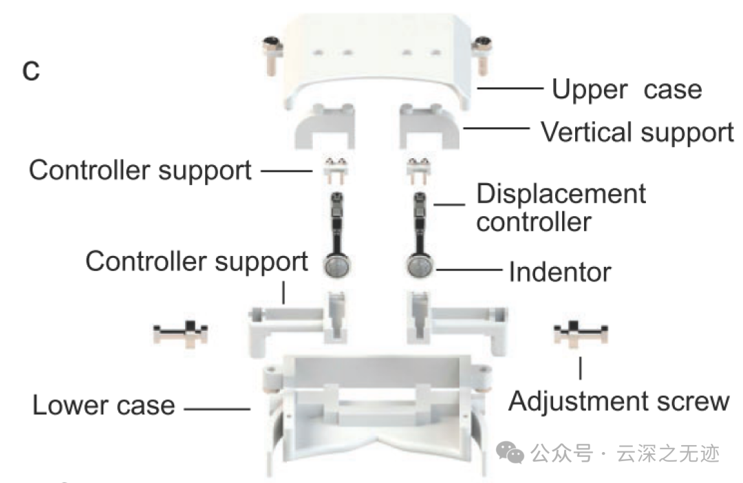 当压头按压并接触柔软物体时,可以捕获特征传感信息——接触力作为位移的函数,而两个传感器显示压力对位移的响应。该系统可以基于压力-位移耦合算法来识别柔软度,神经网络系统。