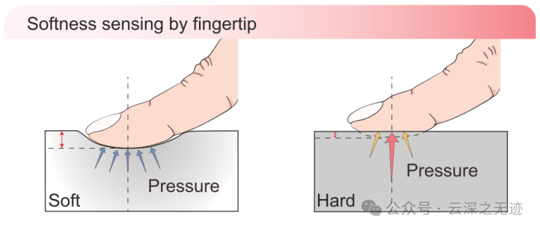 柔软的感觉通常涉及一组机械传感器,它们在按压时“检测”压力和位移。触摸的中心部分往往比边缘部分具有更高的压力。相对均匀的压力分布加上较大的位移,使物体给人一种高度柔软的感觉,而较大的中心到边缘压力差和较小的位移给人一种“硬”的感觉。