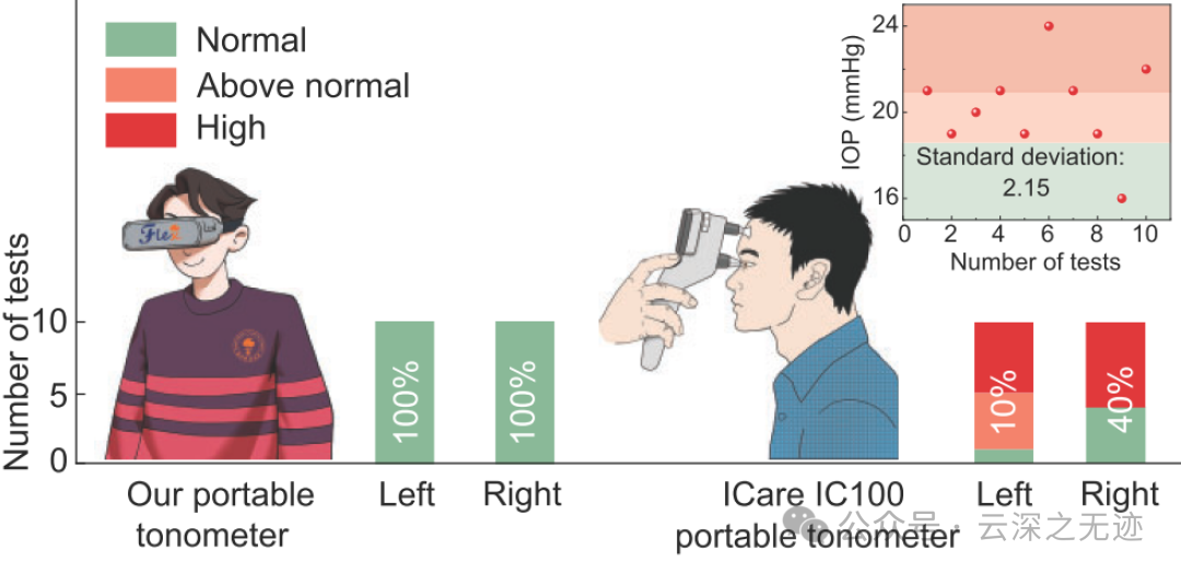 使用广泛使用的基于回弹测量的商用便携式眼压眼压计(ICare IC100)来检测眼压值,而该设备给出的结果明显分散,左眼和右眼的标准偏差分别为 2.15 和 3.07。对应的精度分别为10%和40%。结果表明,与商用可穿戴设备相比,此便携式眼压计表现出更高的可重复性和一致性。