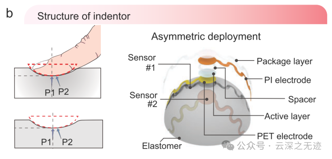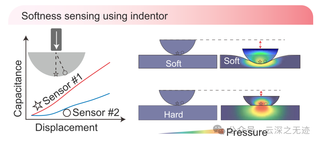 由于半球的对称性和接触的均匀性,只需两个传感器即可收集压力信息以进行柔软度传感。