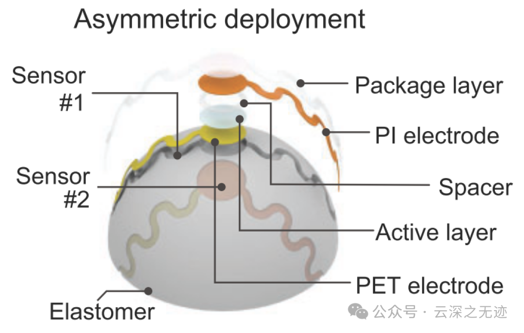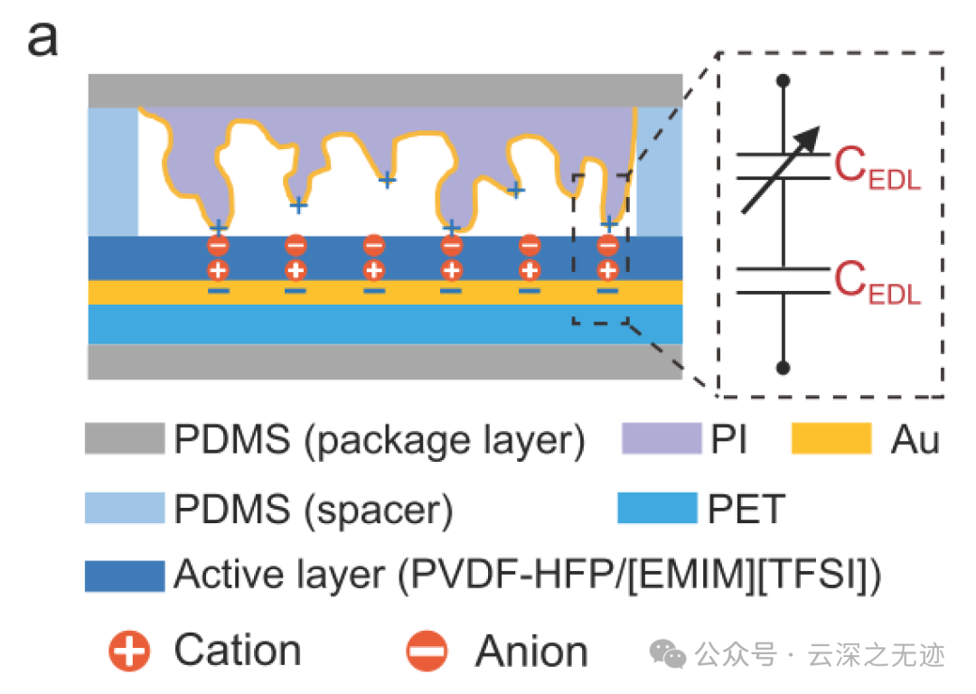该传感器由离子活性层(聚偏二氟乙烯-六氟丙烯)(PVDF-HFP)-1-乙基-3-甲基咪唑鎓双(三氟甲基磺酰基)亚胺([EMIM][TFSI]))组成夹在扁平聚对苯二甲酸乙二醇酯(PET)-金(Au)电极和微结构PI(聚酰亚胺)-Au电极之间,由离子电子传感机制控制。