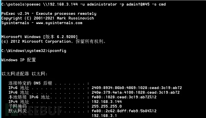 psexec \\192.168.3.64 -s cmd cmd #-s,表示以system权限运行窗口,成功返回目标主机system权限窗口