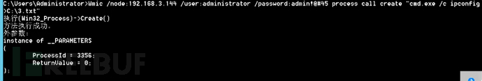 wmic /node:192.168.3.144 /user:administrator /password:admin!@#45 process call create "md.exe /c ipconfig >C:\3.txt"