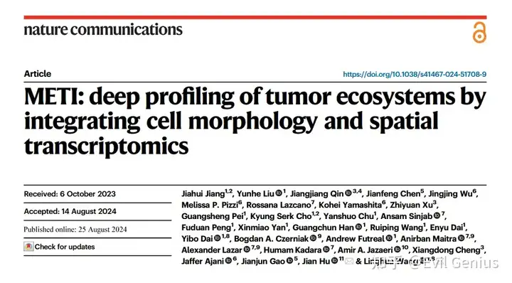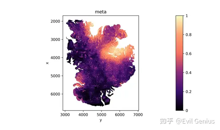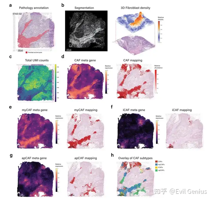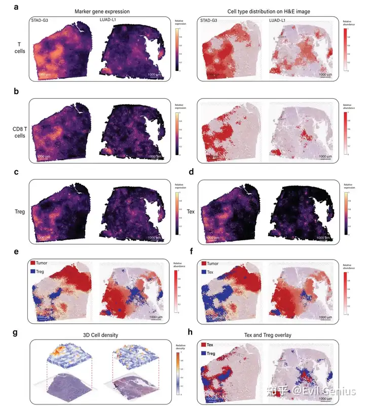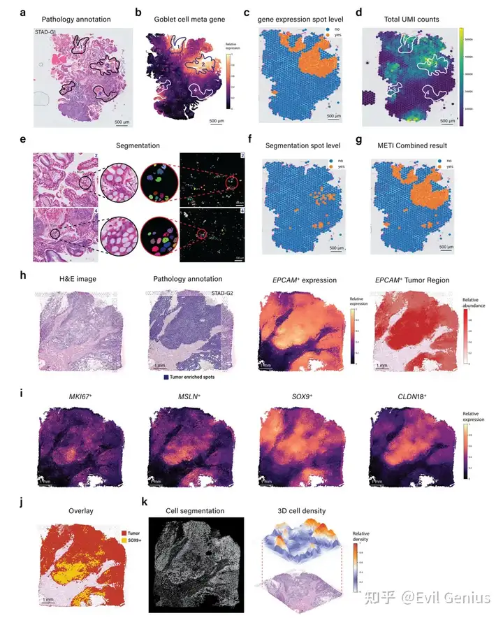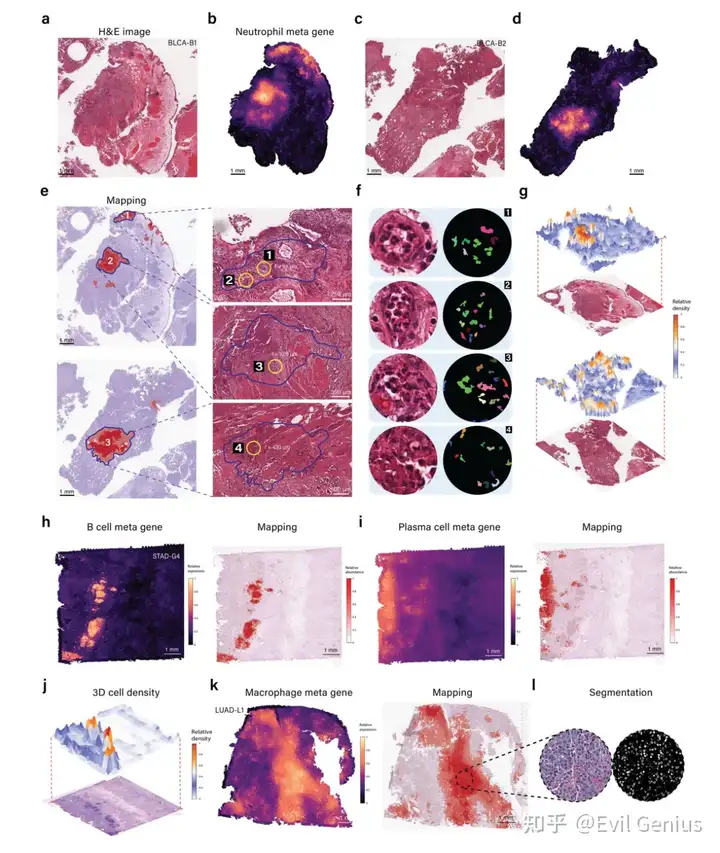 大多数实体瘤起源于上皮细胞,被称为癌,包括胃癌、肺癌、膀胱癌、乳腺癌、前列腺癌和结肠癌,而其他一些实体瘤起源于其他类型的组织,包括肉瘤和黑色素瘤。无论其细胞来源如何,了解恶性细胞的分子特征和细胞异质性对于揭示肿瘤生长、侵袭、转移和治疗反应的机制至关重要。定量生物组织内细胞的空间分布和密度对于各种应用至关重要,特别是在病理学和肿瘤学领域。虽然基因表达提供了一个molecular lens,但相关的H&E图像可以用来测量空间细胞分布和密度。与模块1一样,METI接下来进行肿瘤细胞核分割,生成三维肿瘤细胞密度图,直观地描绘了癌细胞的空间分布和密度。该功能用于传达感兴趣的细胞类型的空间分布、密度和模式。