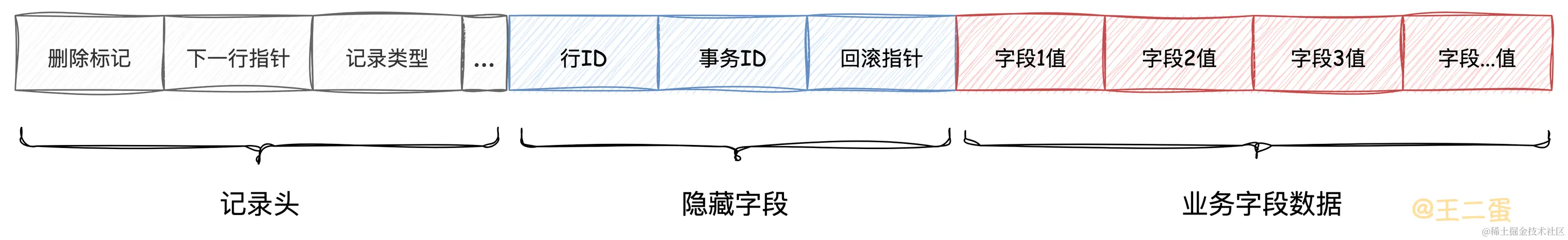 这里的删除标记是行记录的字段,也就是除了业务字段数据,InnoDB默认为每行记录添加的字段,所以一个行记录大概如下图,这也是之前提到过的「行格式」。