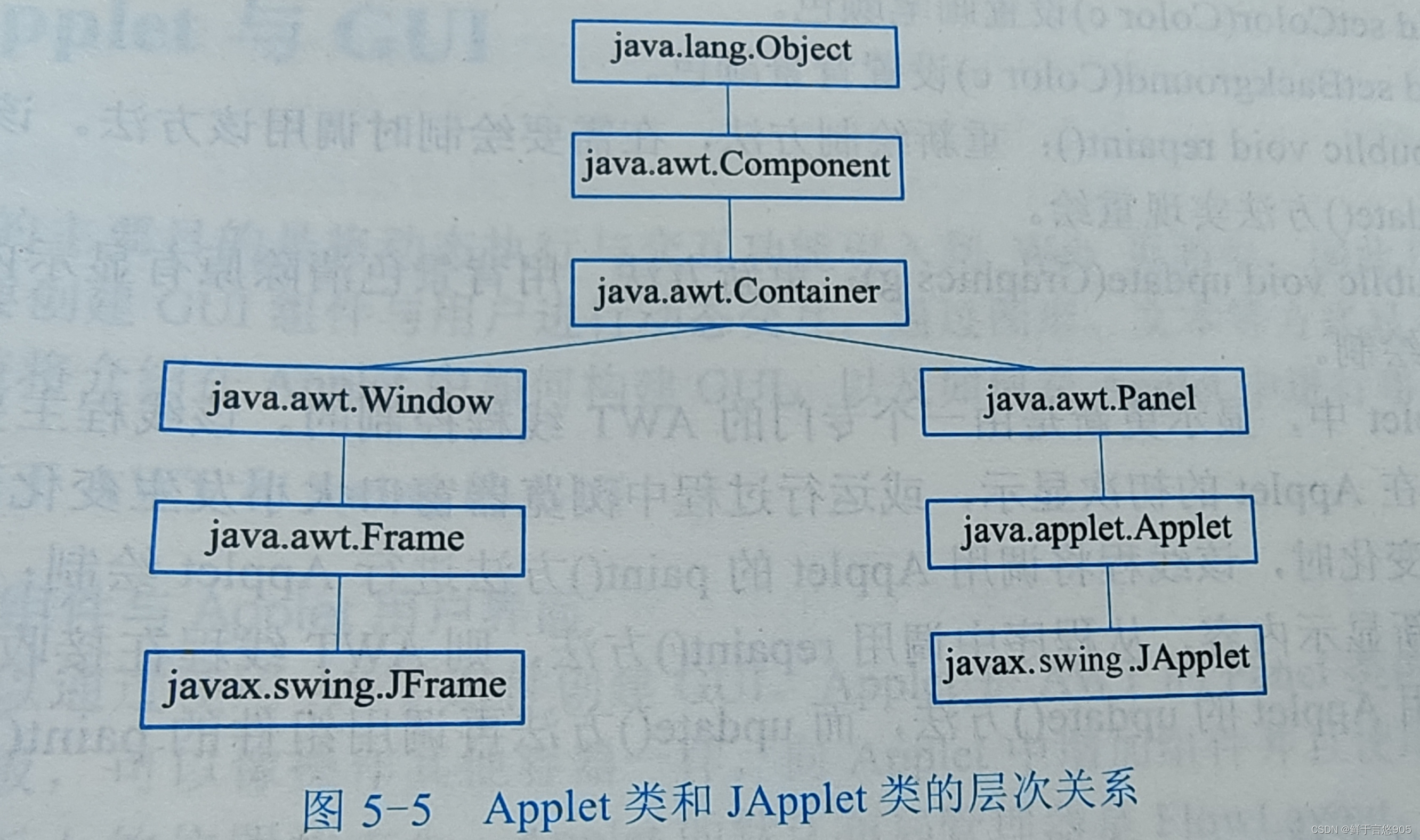 Applet 类是 Java 类库中一个重要的系统类,存在于 java.applet 包中。JApplet 类是Applet类的扩展,增加了对swing 组件的支持。Applet 类和 JApplet 类是所有 Java Applet 应用的基类,所有的 Java 小程序都必须继承它们。Applet 类和 JApplet 类的层次关系如图所示。