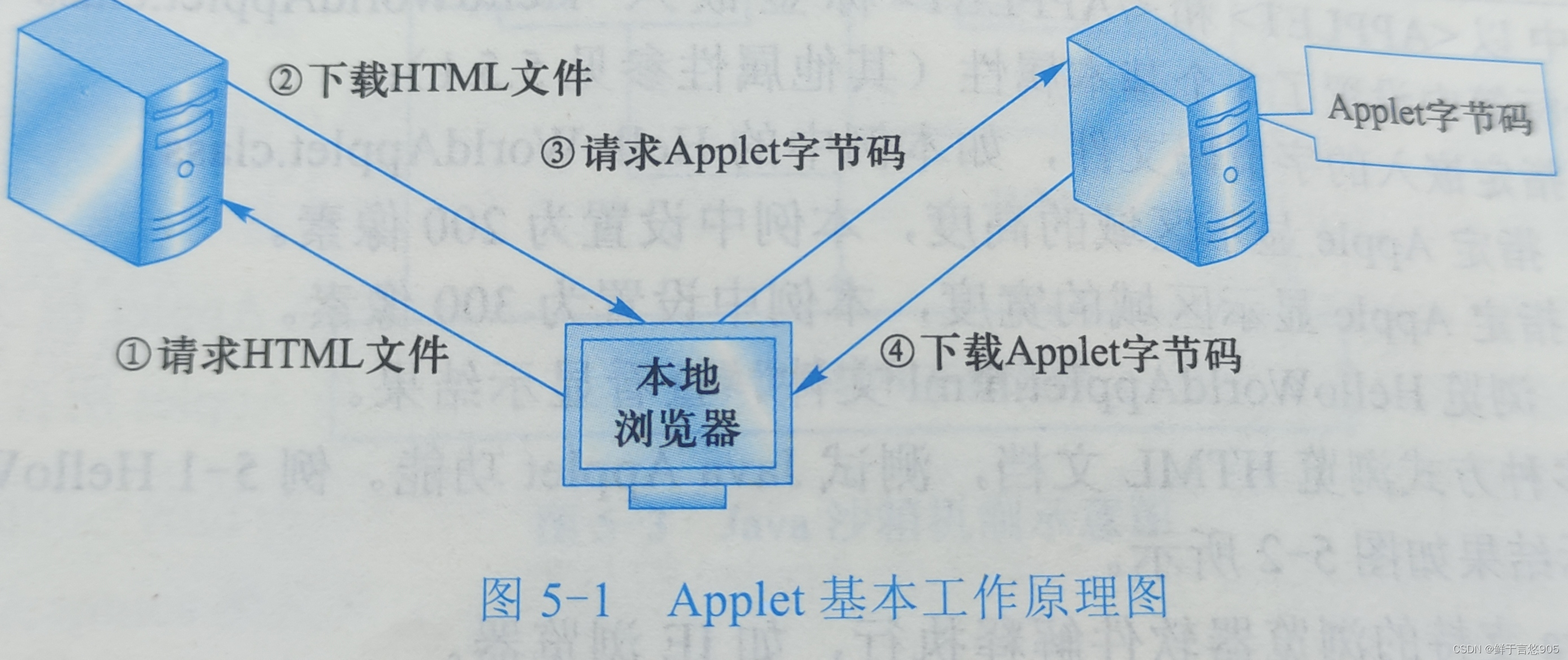 Java Applet 通过<APPLET>、<IAPPLET>标签嵌入 HTML 网页,当用户使用浏览器软件浏览这个HTML 页面时,浏览器通过文件名找到 Java Applet 字节码文件并下载到用户的机器上,利用浏览器的Java解释器直接执行该字节码。Applet的基本工作原理如图所示。