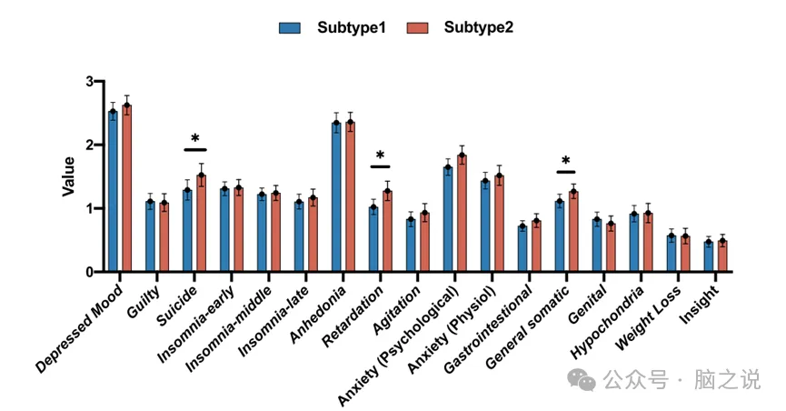 图7. 抑郁症状的亚型特异性临床特征(HAMD-17)在不同的聚群间表现出显著差异(𝑃< 0.05,双样本𝑡检验,错误发现率校正)。星号表示与不同亚型之间的平均症状严重程度评分有显著性差异(𝑃< 0.05),误差条表示均值的标准误差。∗𝑃< 0.05.