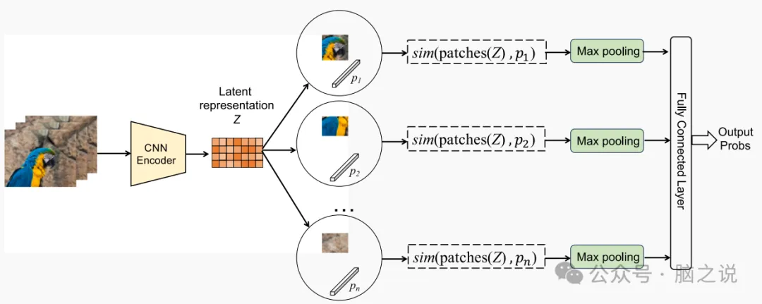 图1. 传统的图像识别原型学习。给定一个输入图像𝐼,框架使用卷积神经网络(CNN)𝑓提取图像表示𝑍=𝑓(𝐼),并学习𝑛原型向量𝑃={𝑝𝑖}𝑛𝑖=1。随后,框架计算𝑗th原型𝑝𝑗与所有𝑍补丁之间的距离,然后将其进行反转,得到相似度得分𝑠𝑖𝑚(𝑍,𝑝𝑗)= max𝑧∈patches(𝑍)