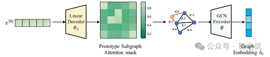 图4. 原型子图生成器的生成过程。给定𝑧,我们使用另一个线性解码器𝜃2来生成原型子图注意掩模。然后将训练好的原型子图注意掩码输入图编码器𝜙,输出嵌入的原型子图。