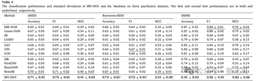 表4显示了在三个精神病学数据集(即ABIDE、REST-meta-MDD和SRPBS)上的准确性、f1分数和马修相关系数(MCC)的分类性能。每个模型独立运行5次,并报告了指标的平均值和标准差。