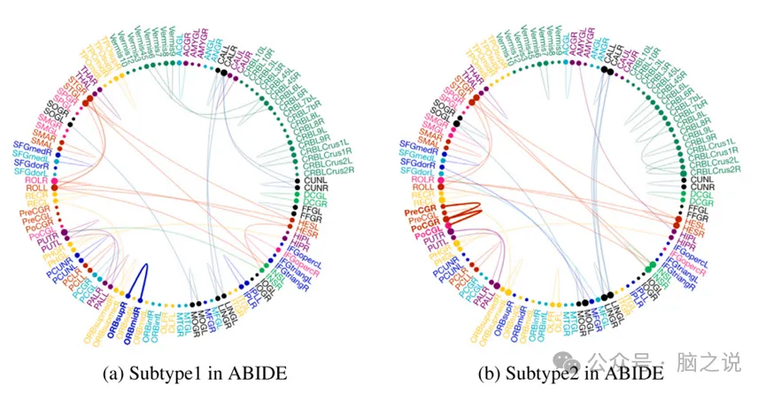 图10显示了SRPBS数据集中健康对照组和精神分裂症组之间的主要原型子图比较。我们观察到两种亚型内的大脑连接存在显著差异,这可能归因于该数据集的样本量有限。具体来说,精神分裂症亚型在边缘网络内表现出紧密的相互作用,特别是在右侧内侧眶上额叶。相反,精神分裂症亚型在左脑岛内表现出紧密的相互作用。