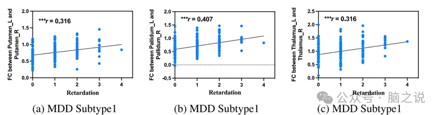 图11. 显性原型子图的FC与亚型分化的HAMD-17评分之间存在显著相关性。∗∗∗𝑃< 0.0001.
