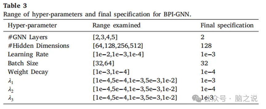 我们使用PyTorch 1.12.1和PyTorch几何图形2.1.0对BPI-GNN进行了训练和测试。在训练过程中,历元的数量设置为350,辍学率设置为0.5。表3显示了所检查的超参数的范围,并使用了所有超参数的最终规范来获得最终结果。超参数可以通过网格搜索或基于相关工作的推荐设置来设置。对于基线,我们用350个时代来训练每个模型。对于传统的精神学分类器,包括具有线性和RBF核的SVM、RF和LASSO,我们首先使用FC网络在患者组和HC组之间进行双样本𝑡检验,以获得异常的FC连接。然后将这些连接为一个长特征向量,并发送到分类器。对于GIN、GAT和GCN,我们使用相关工作中推荐的超参数来训练模型。对于SIB和BrainIB。对于ProtGNN,超参数𝜆1、𝜆2和𝜆3分别根据推荐的设置设置为0.10、0.05和0.01。