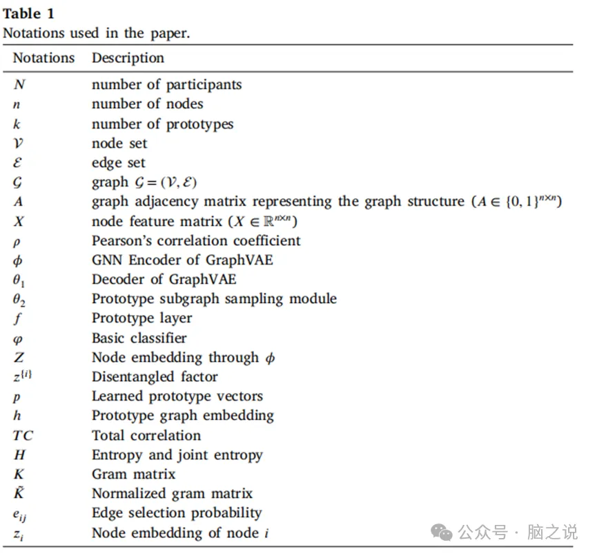 图2描述了从rs-fMRI原始数据构建脑功能图的管道。首先,对静息态fMRI数据进行预处理,然后根据自动解剖标记(AAL)图谱将大脑分割成𝑛感兴趣区域(ROIs)。随后,从预处理后的fMRI数据中计算每个ROI的平均时间序列,并通过计算ROI的平均时间序列之间的皮尔逊相关性,得到功能连接(FC)矩阵。在FC的基础上,我们定义了一个无向图,其中𝐴表示表示图结构的图邻接矩阵,𝑋表示节点特征矩阵。具体来说,𝐴是一个二值化的FC矩阵,其中只有相关性的前20个百分位的绝对值被转换为1,而其余的则被设置为零。对于节点特征𝑋,节点𝑟的𝑋𝑟被定义为,其中𝜌𝑟𝑙为节点𝑟和节点𝑙的皮尔逊相关系数。值得注意的是,在本研究中,只考虑功能连接值作为节点特征,这是大脑网络分析中常见的做法。所有的符号都列出在表1中。