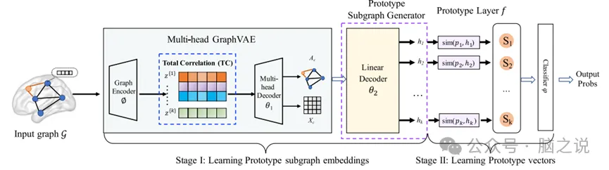 图3描述了BPI-GNN的工作流程,它由四个关键组件组成:一个多头图变分自动编码器(GraphVAE),一个原型子图生成器,一个原型层𝑓和一个基本分类器𝜑。我们采用了一个两步训练策略来联合优化生成性能和诊断准确性。