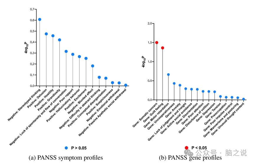 图9. 亚型特异性PANSS阳性/阴性症状谱和PANSS基因谱在不同聚类间表现出显著差异(𝑃< 0.05,双样本𝑡检验,错误发现率校正)。红色圆圈表示有显著性差异(𝑃< 0.05)。PANSS,阳性和阴性综合征量表。