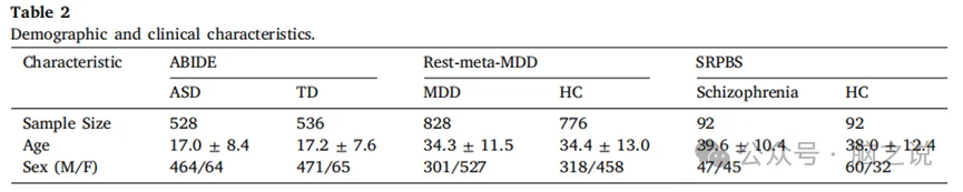在这项研究中,使用了三个精神病学数据集:自闭症脑成像数据交换I (ABIDE),Rest-meta-MDD和日本脑科学促进战略研究计划(SRPBS)。Sider是一个自闭症谱系障碍(ASD)的回顾性多中心神经成像联盟,公开分享了从17个不同的国际中心收集的1000多个恢复状态功能磁共振成像数据。在本研究中,共使用了528例ASD患者和536例典型发育型(TD)患者。Rest-meta-MDD是迄今为止从中国25个队列中收集的最大的重度抑郁症(MDD)静息态fMRI数据库。根据排除标准,采用1604例参与者,其中828例MDD患者和776例健康对照组。SRPBS是一个多障碍MRI数据集,包括在11个地点收集的1410名参与者。在目前的研究中,我们使用了184名参与者,包括92名精神分裂症患者和92名健康对照组。我们在表2中展示了三个精神病学数据集的人口统计学和临床特征。