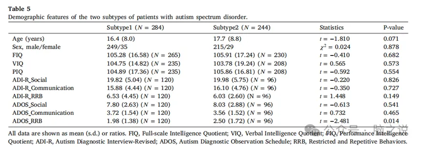 表5显示了每个亚型的人口统计学和临床数据。在ASD患者中,与亚型2相比,亚型1的ADOS_RRB显著减弱。