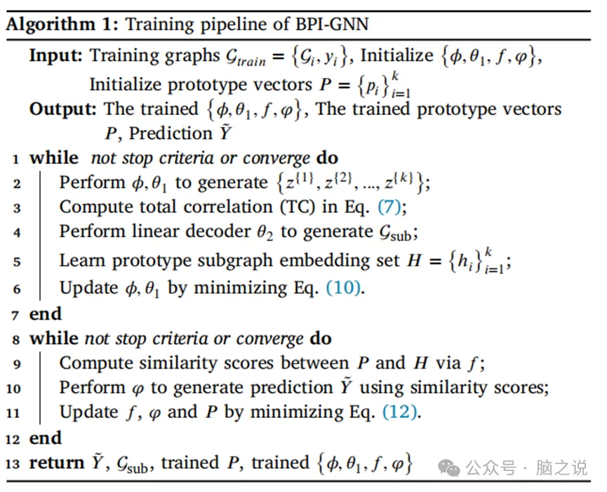 综上所述,BPI-GNN的训练过程见算法1。我们首先执行GraphVAE和原型子图生成器来学习原型子图嵌入 (10).在第一阶段训练收敛后,表明重构误差低于预定阈值或超过一定数量的训练时期,我们学习原型向量并获得用于分类的预测。接下来是对等式的优化 (12)。