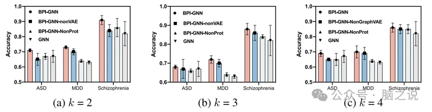 为了研究原型数量𝑘对性能的影响,我们使用训练集和验证集对𝑘∈{2,3,4}进行了超参数调优。此外,我们还进行了一项融合研究,以评估BPI-GNN中各种成分的潜在贡献。具体来说,我们比较了BPI-GNN的四种变体的分类精度,即原始模型BPI-GNN-NonVAE,、BPI-GNN-NonProt和GNN。值得注意的是,BPI-GNNNonVAE省略了修改后的GraphVAE的解码器和等式的优化。消融研究的结果如图5所示。从图5中可以明显看出,𝑘的值对BPI-GNN的性能有影响。基于最优性能,我们将ABIDE数据集的𝑘值设置为2,REST-meta-MDD数据集设置为2,SRPBS数据集设置为2。在融合研究中,我们观察到BPI-GNN在所有数据集上的性能都优于BPI-GNN-NonProt,这表明识别不同原型的能力有助于提高性能。此外,BPIGNN优于BPI-GNN-NonVAE的性能表明,GraphVAE在该模型中是有效的和至关重要的。
