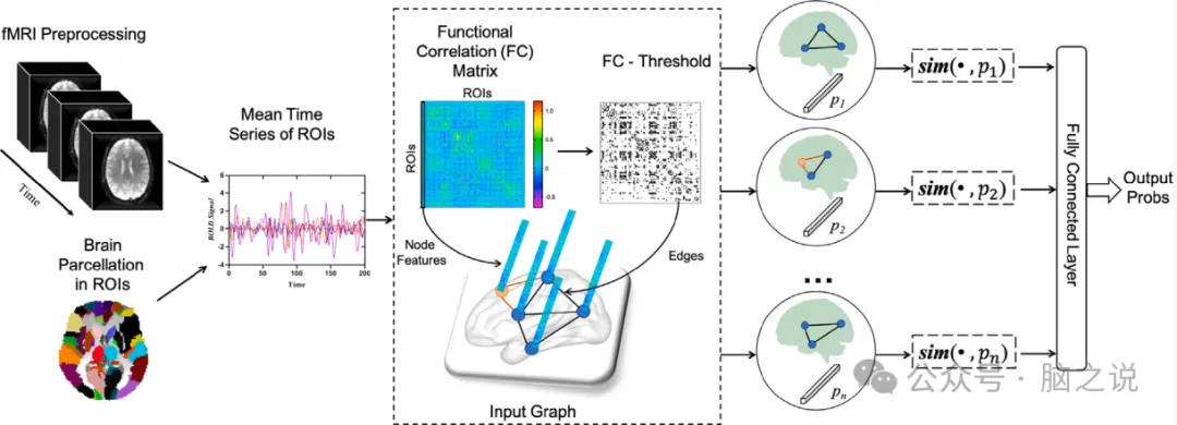 图2. 脑网络分析的原型学习(例如,BPI-GNN)。静息态功能磁共振成像数据进行预处理,随后使用图谱将其划分为感兴趣的区域。然后通过ROI之间的皮尔逊相关性生成功能连接(FC)矩阵。这些FC矩阵被用来构建大脑功能图。然后,BPI-GNN生成一组原型子图,并学习𝑛原型向量。随后,BPI-GNN计算了原型和原型子图之间的相似性。最后,将𝑛相似度得分发送到全连通层,以产生输出概率。