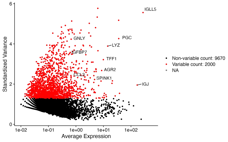 # 它就是默认的前面的 FindVariableFeatures 函数的2000个基因