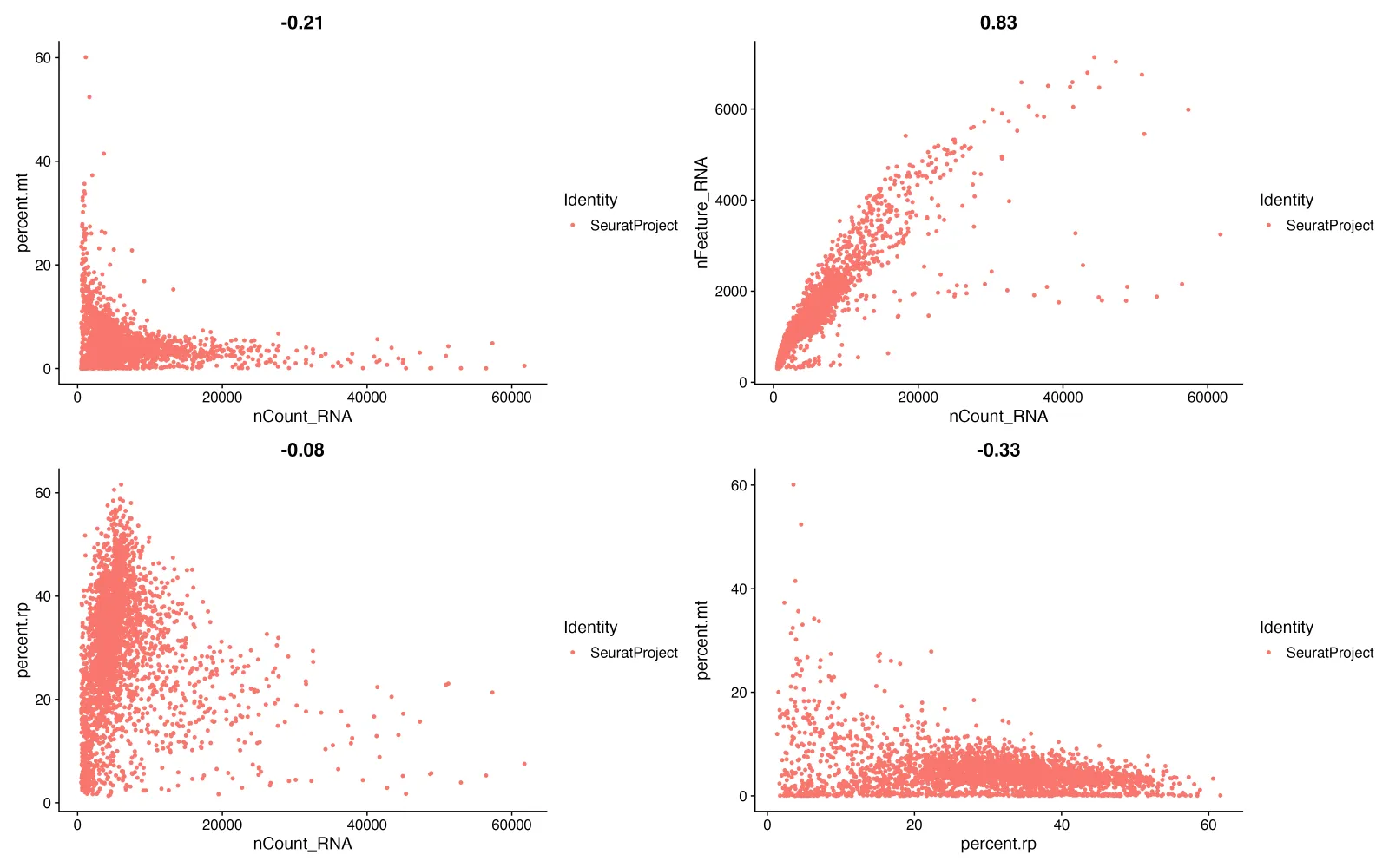 2、右上角 (nFeature_RNA vs. nCount_RNA): 相关性系数 (0.83):表现出强正相关,说明随着 RNA 数量的增加,检测到的基因数目也在增加,这是预期的结果。
