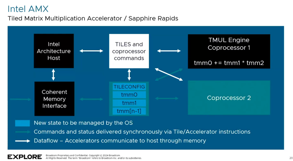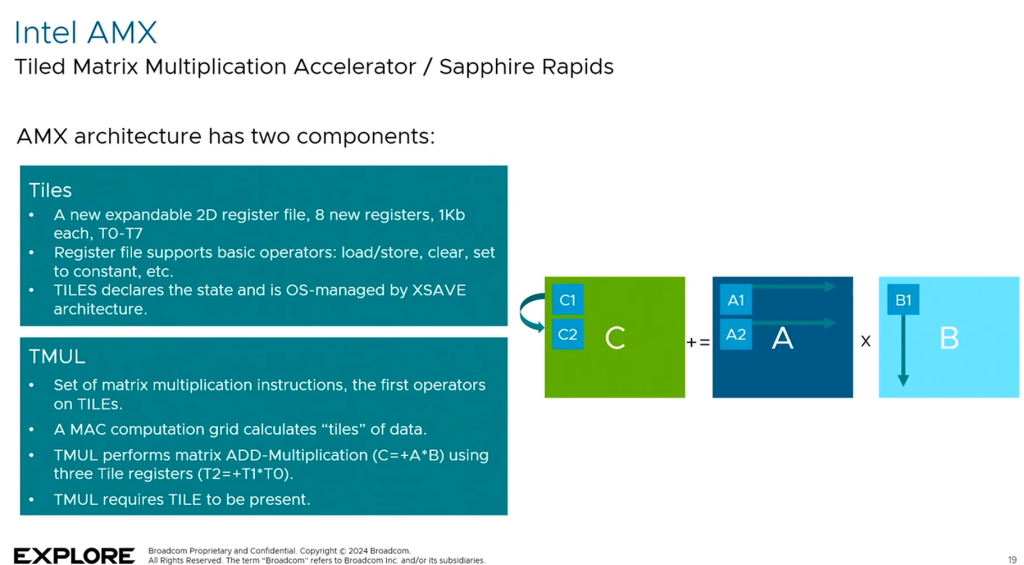 Broadcom 的研发首席工程师 Earl Ruby 在本次会议上发言时表示,AMX 于 2023 年推出,引入了“称为 tile 的二维寄存器,加速器可以在其上执行操作”。