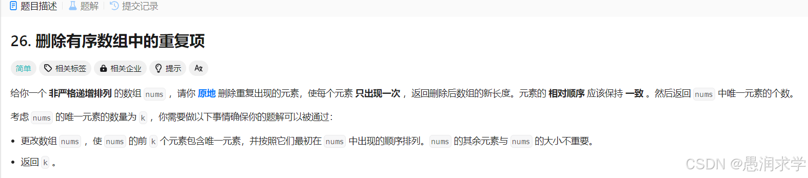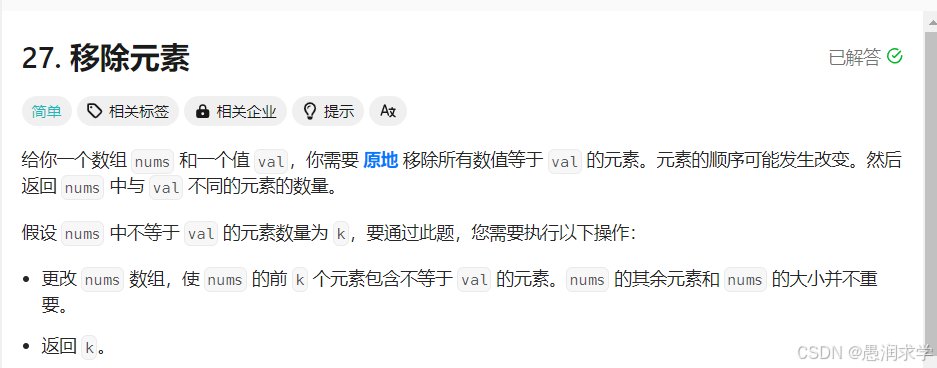 题目只要求前K歌元素包含不等于val的元素,所以只需要把不是val的元素全部放在数组前面,并记录元素个数即可