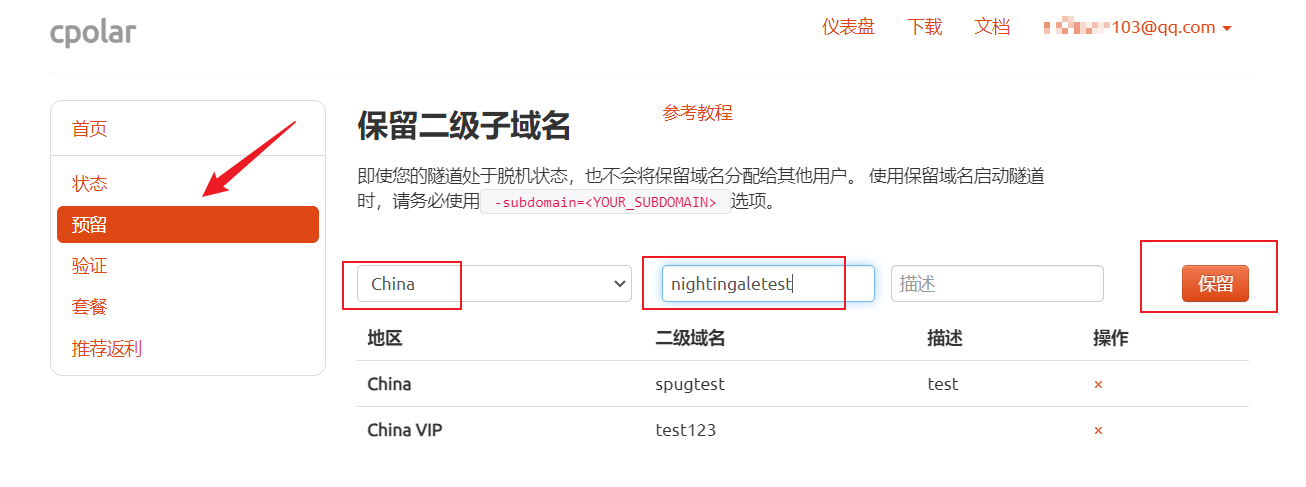 登录cpolar官网,点击左侧的预留,选择保留二级子域名,设置一个二级子域名名称,点击保留,保留成功后复制保留的二级子域名名称